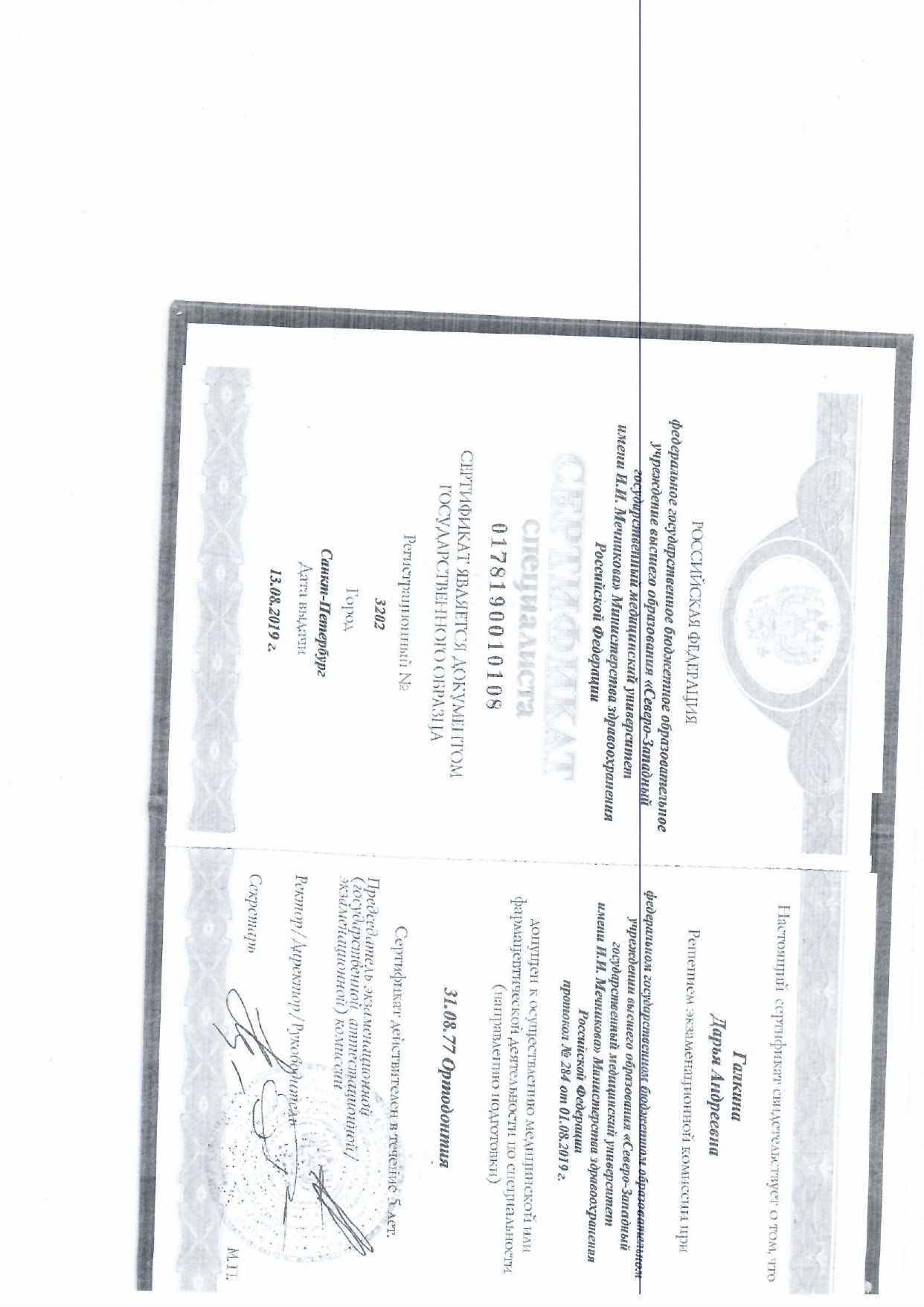 Выпускница Санкт-Петербургского Государственного Медицинского Университета им. академика И.П. Павлова. (г.Санкт-Петербург, 2017г.). Окончила клиническую ординатуру по специальности «Ортодонтия» на базе Северо-западного Государственного Мединского Университета им. И.И. Мечников (г.Санкт-Петербург, 2019г.).
