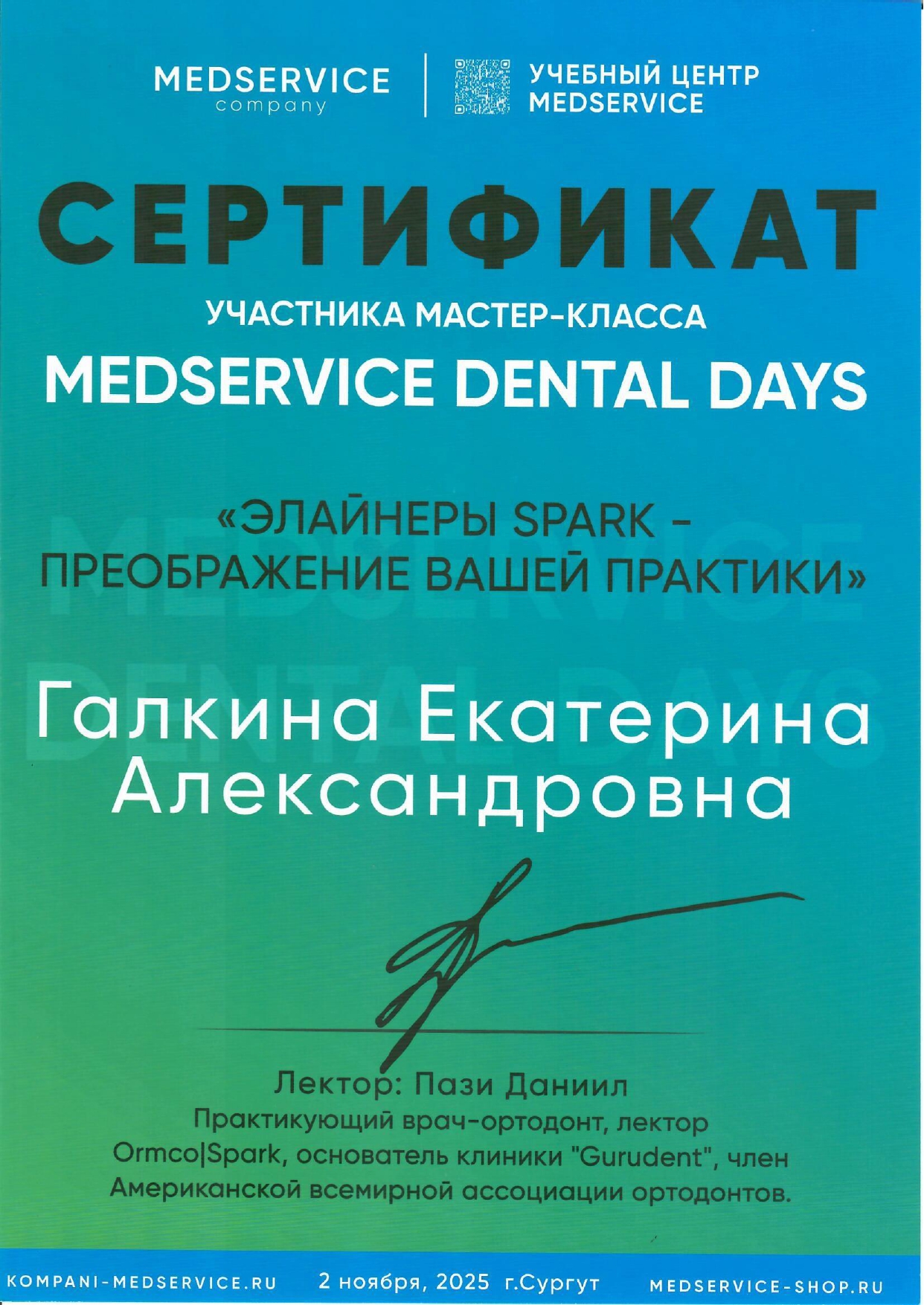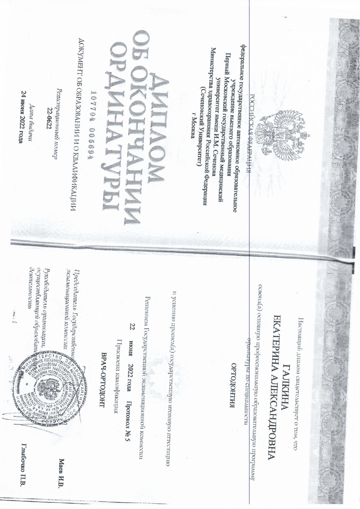 В 2022 году успешно окончила ординатуру по специальности Ортодонтия на базе Первого Московского государственного медицинского университета им. И.М. Сеченова.