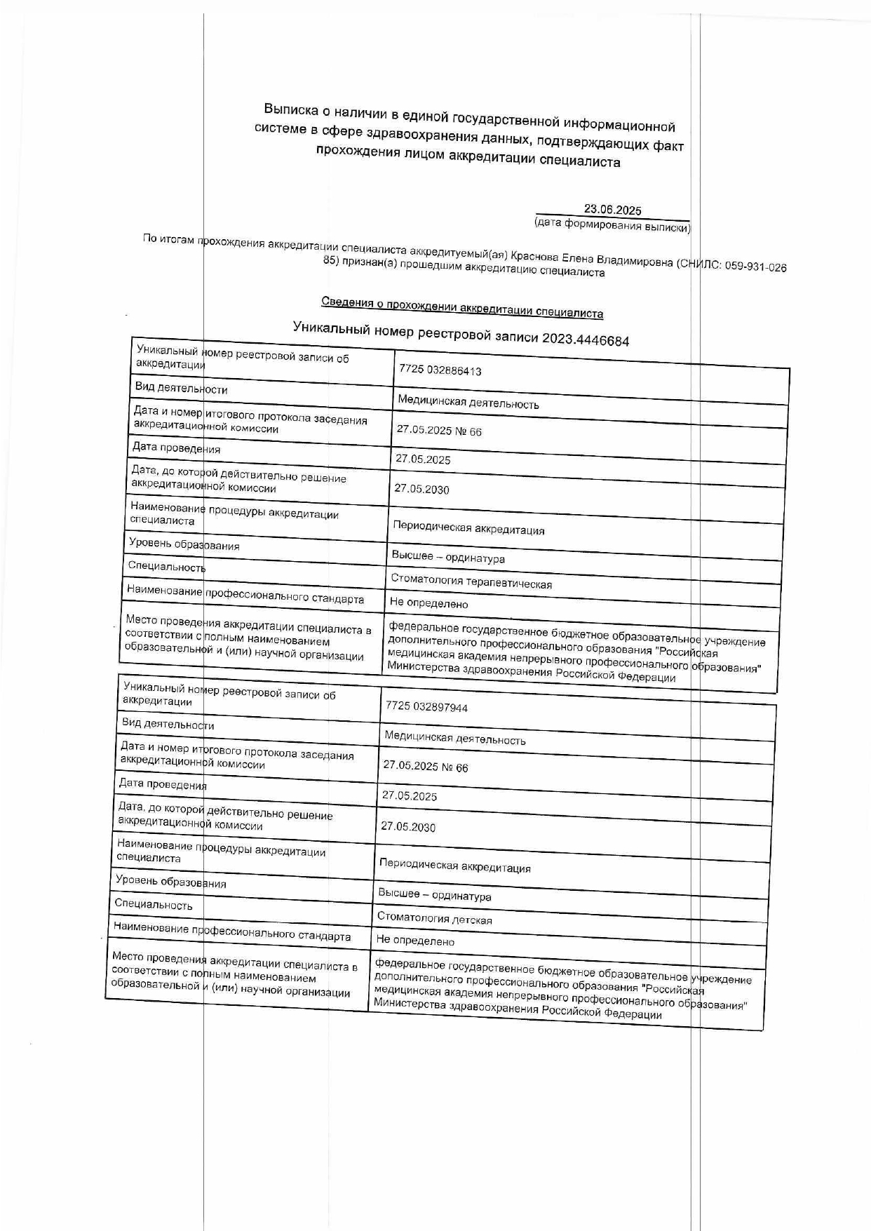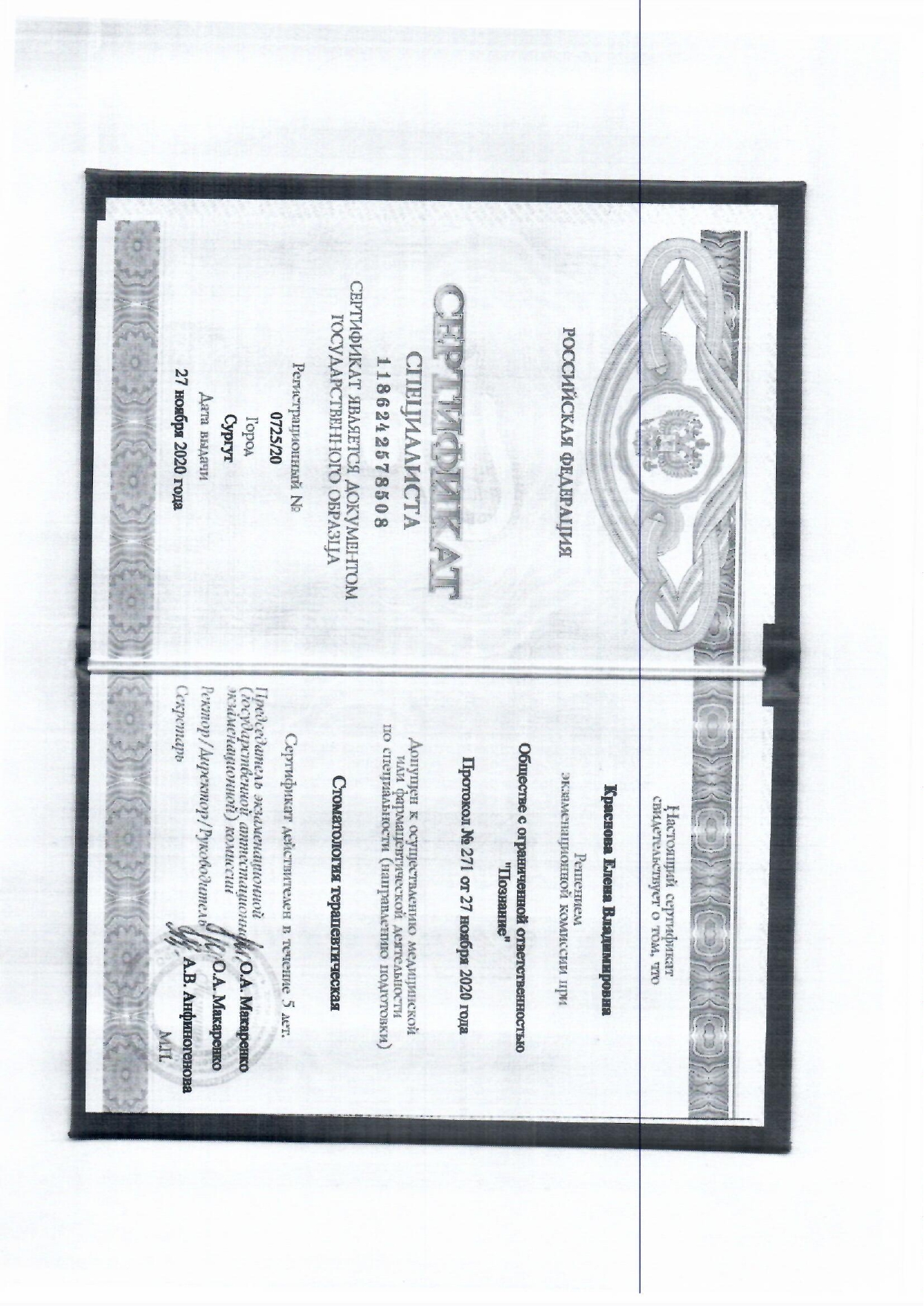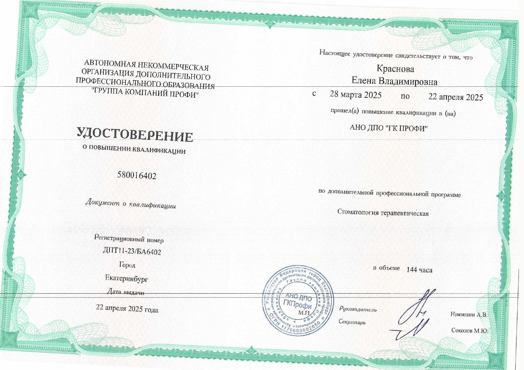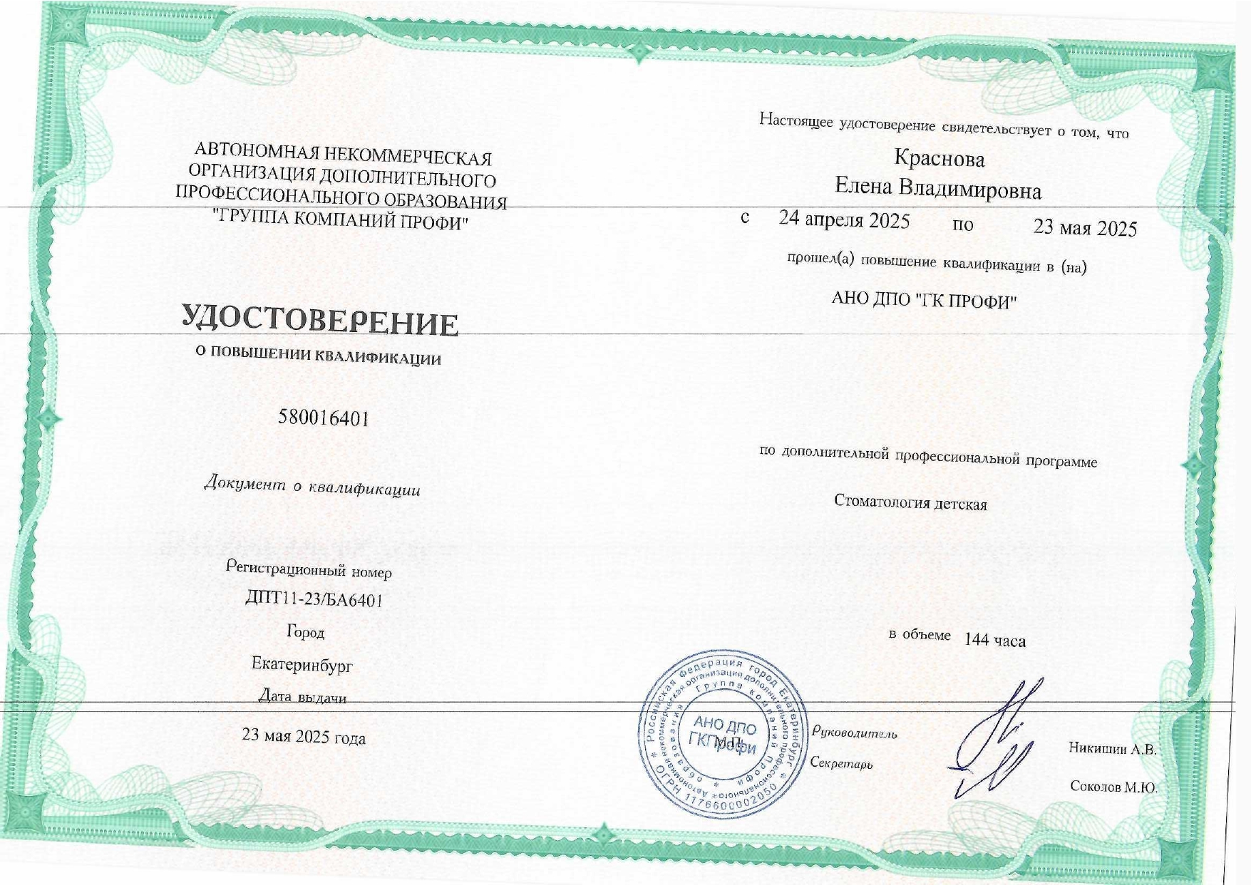 Выпускница Омской Государственной Медицинской Академии (1996 г). 1996-97гг. проходила интернатуру на базе детского отделения ГСП№ 1 г. Сургута. После окончания интернатуры получила сертификат по специальности «Стоматология терапевтическая». Участвует во внутренних ежегодных стоматологических конференциях. Посещает ежегодные стоматологические выставки.