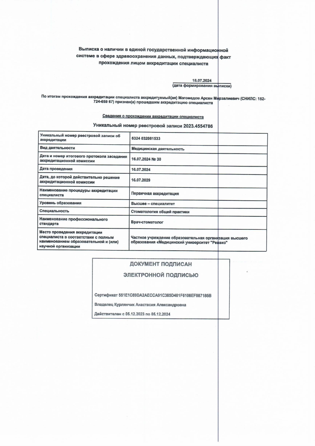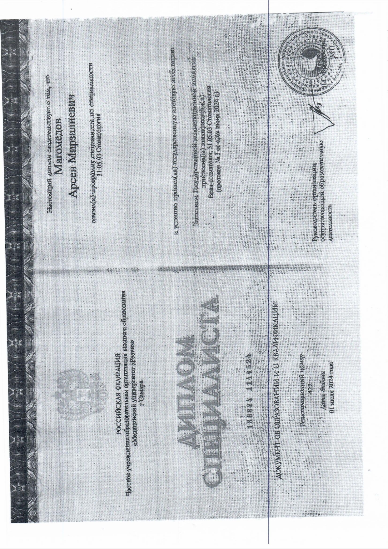 Диплом: 2024 - Диплом Частного учреждения образовательной организации высшего образования "Медицинский университет "Реавиз" (г. Самара), квалификация - врач-стоматолог